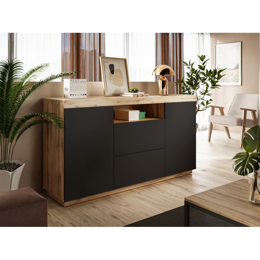 Komoda YOSHI ze względu na mnogość schowków, wyróżnia się niebywałą funkcjonalnością. Mebel posiada dwie pojemne szafki otwierane nowoczesnym systemem push-open, dwie wysuwane szuflady i praktyczną wnękę - rozkład ten pozwala pomieścić i wygodnie przechować najbardziej przydatne rzeczy. Mebel idealnie sprawdzi się zarówno w salonie, jak i jadalni, gdzie stanie się ciekawą ozdobą przykuwającą wzrok. Wystarczy zestawić ją z naszą szafką RTV Yoshi z tej samej kolekcji a z pewnością Twoje mieszkanie stanie się piękniejsze i jednocześnie niezwykle praktyczne.