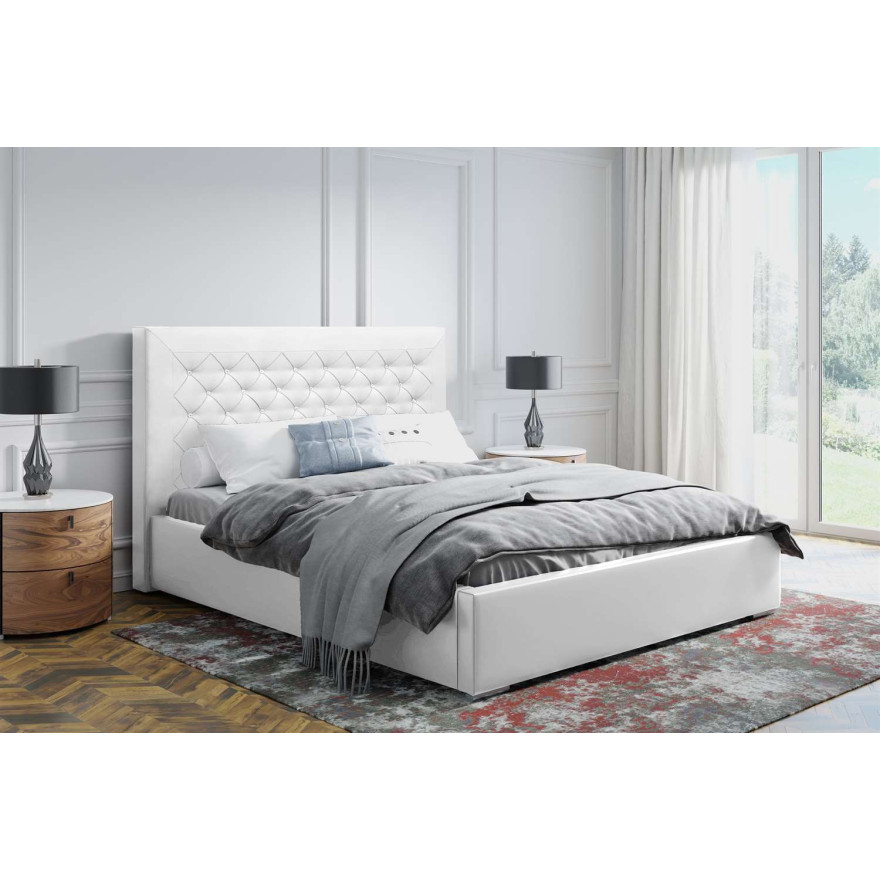 Prezentowane łóżko wyróżnia się na tle innych produktów za sprawą pikowanego wezgłowia, które wprowadzi do Twojego wnętrza akcent luksusu. Oryginalne przeszycia na pikowanym zagłówku, który ozdobiony został cyrkoniami wyglądem przypominającymi kryształki nadaje ekskluzywnego charakteru i doskonale komponuje się z chromowanymi nóżkami. Szeroki wachlarz materiałów, pozwala dobrać kolor oraz wzór zgodnie z oczekiwaniami.