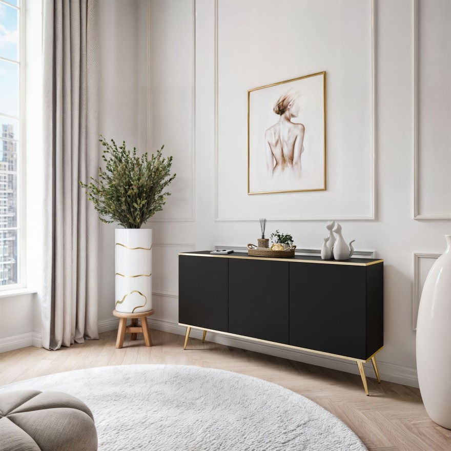 Minimalistyczna bryła komody została wzbogacona o subtelne złote detale, które nadają jej wyrafinowanego charakteru. Smukłe, skośne nóżki wykonane z metalu w kolorze złotym dodają konstrukcji lekkości, a jednocześnie zapewniają jej stabilność. Ozdobne złote obrzeża na górnym i dolnym blacie harmonijnie dopełniają całość, podkreślając luksusowy wygląd mebla.