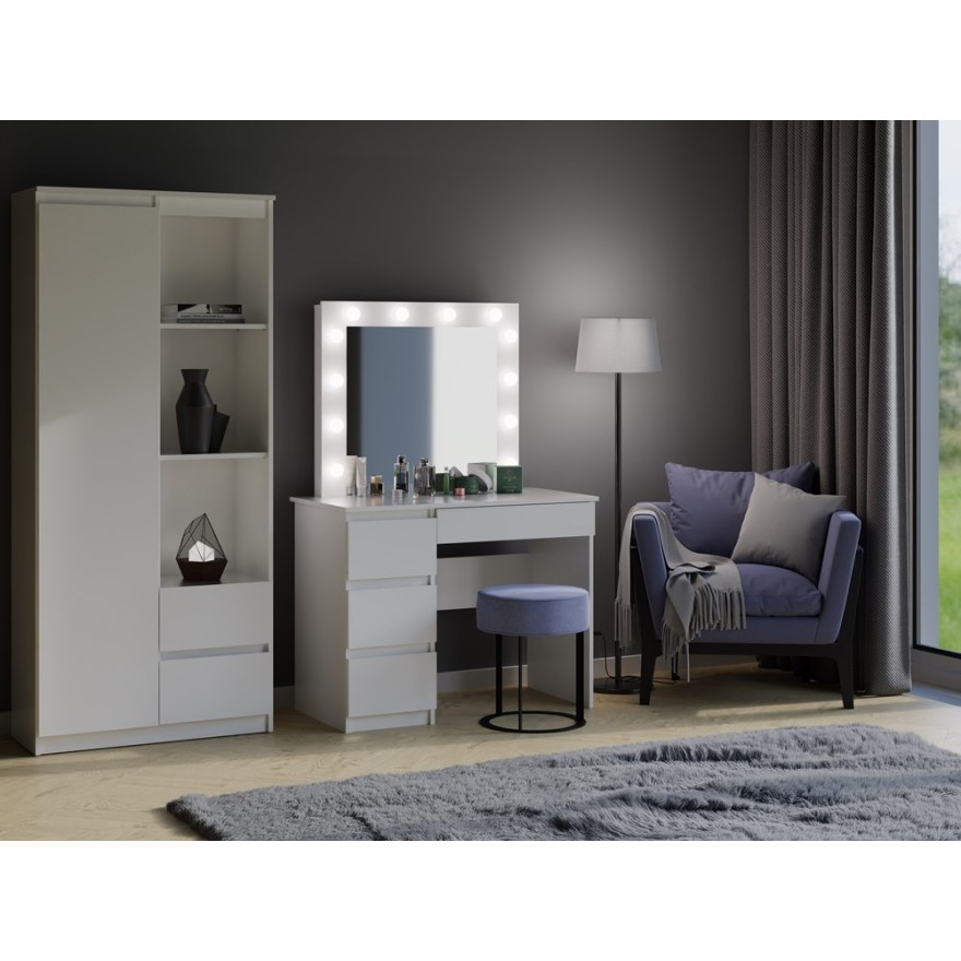Toaletka CASSIE III z lustrem i oświetleniem LED to elegancki i funkcjonalny mebel, który idealnie uzupełni każde wnętrze. Dzięki nowoczesnemu designowi, połączeniu lustra i energooszczędnego oświetlenia LED, toaletka CASSIE zapewnia nie tylko wygodę codziennego użytkowania, ale także podkreśla estetykę Twojego pokoju.