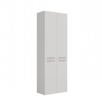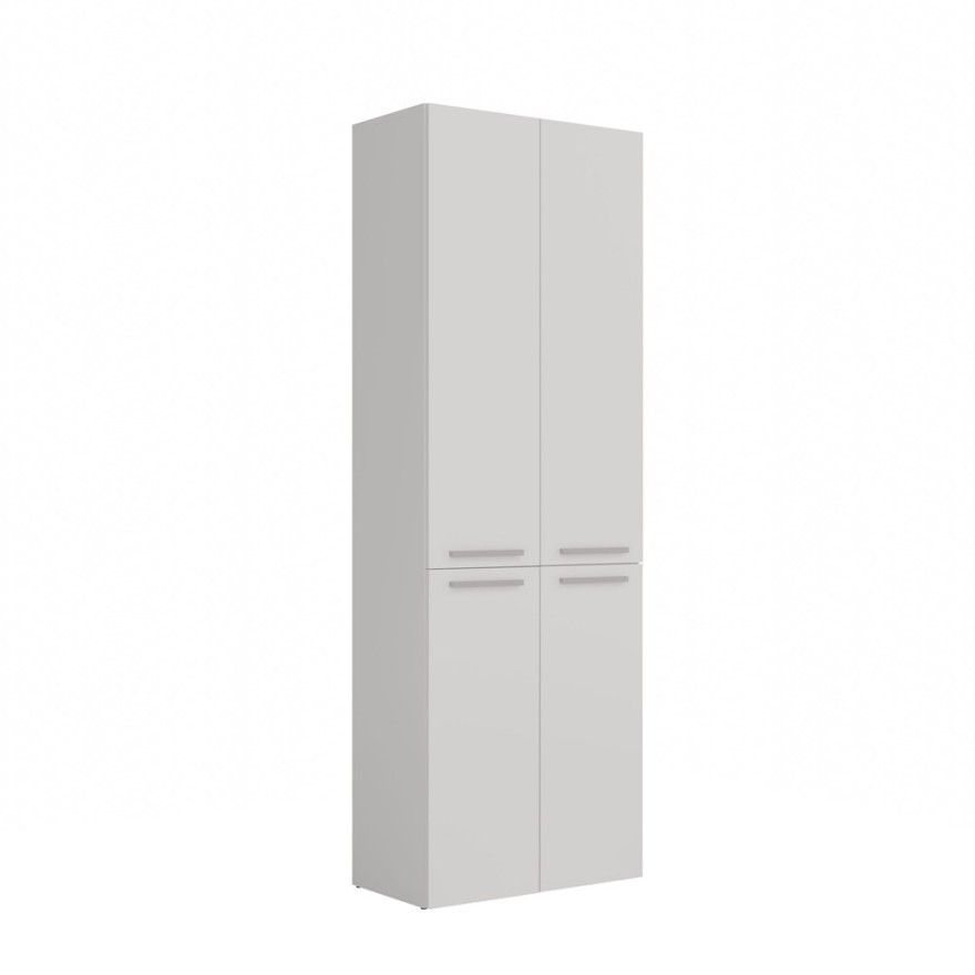 Biała szafka łazienkowa z uchylnym koszem na pranie. Wersja z długimi drzwiami i dwoma koszami.
