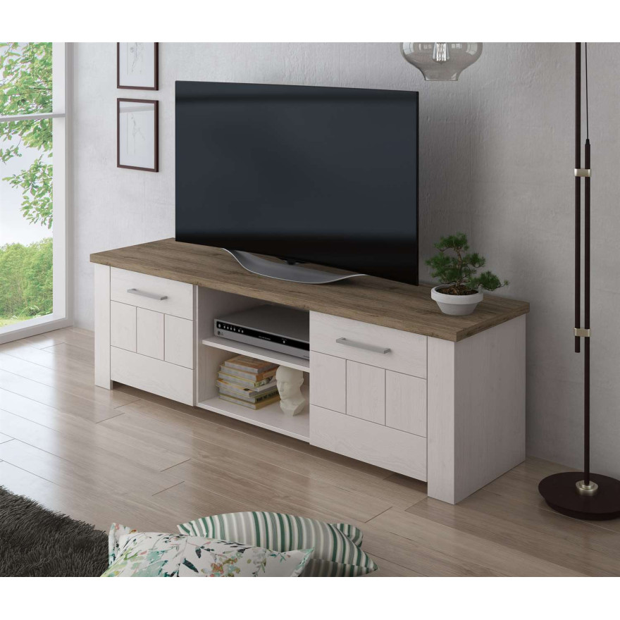 Szafka RTV ROMA została wykonana z solidnej płyty laminowanej, która cechuje się jednolitą strukturą i odpornością na wilgoć. Gładka powierzchnia, o matowym wykończeniu, imitującym drewno, nadaje całości wyjątkowego charakteru.