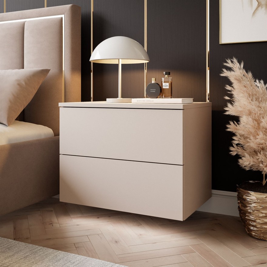 Szafka nocna LINA KASZMIR w wersji wiszącej wnosi do sypialni lekkość, elegancję i przytulny klimat. Jej dopracowane detale i subtelne oświetlenie sprawią, że wieczorny odpoczynek będzie jeszcze przyjemniejszy.