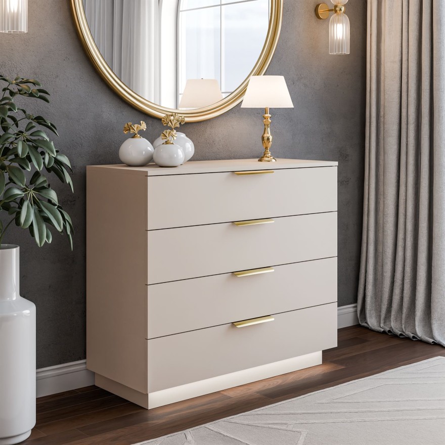 Wykończenie w kolorze kaszmiru wprowadza do wnętrza subtelną, nowoczesną elegancję. Ten uniwersalny odcień doskonale łączy się z jasnymi aranżacjami, naturalnymi dodatkami i stonowaną paletą barw. Całość dopełniają uchwyty krawędziowe, które nadają komodzie nutę luksusu i przyciągają wzrok swoim delikatnym połyskiem.