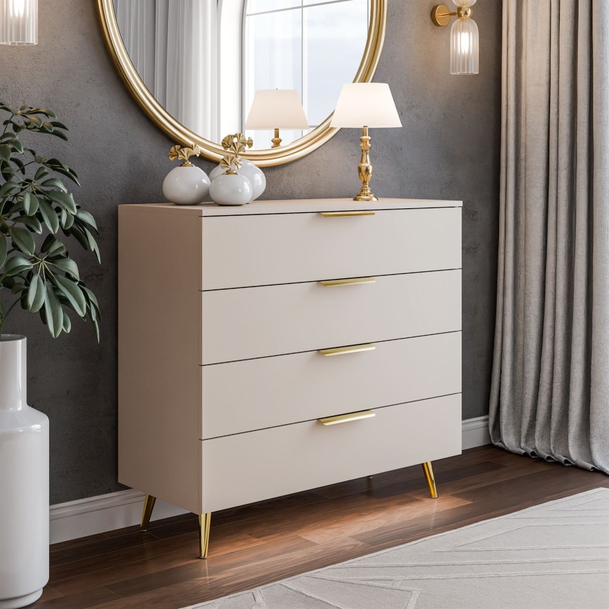 Mimo kompaktowych wymiarów komoda oferuje cztery pojemne szuflady, które zapewniają komfortowe przechowywanie drobiazgów, ubrań czy dokumentów. To idealny wybór do salonu, sypialni, przedpokoju lub domowego biura.