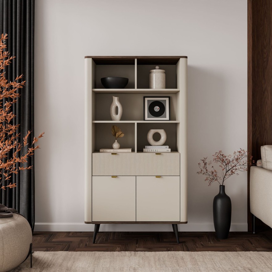 Regał AUTUMN łączy eleganckie kaszmirowe fronty z praktycznym układem półek, szuflady i zamykanych drzwiczek. Subtelne detale i ryflowany akcent nadają wnętrzu nowoczesnego, stylowego charakteru.