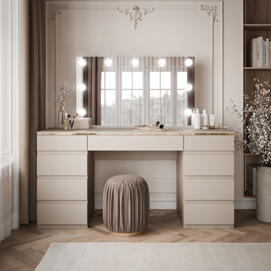 Modne wybarwienie kaszmiru nadaje meblowi subtelnej elegancji i pozwala na harmonijne dopasowanie do różnych aranżacji wnętrz. Całość uzupełnia delikatny złoty pasek, który podkreśla ekskluzywny charakter toaletki i dodaje jej wyrazistości.