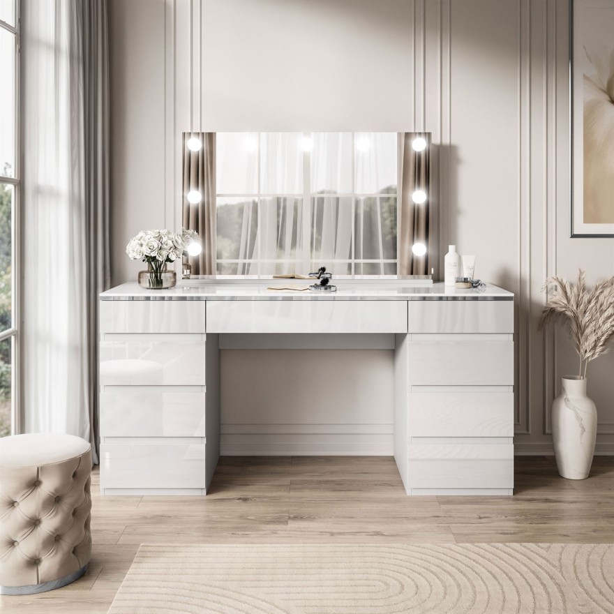 Toaletka AURORA DOUBLE w białym połysku ze srebrnym paskiem łączy elegancki design z praktycznymi szufladami i lustrem LED, tworząc funkcjonalną i stylową strefę pielęgnacji w Twoim wnętrzu.