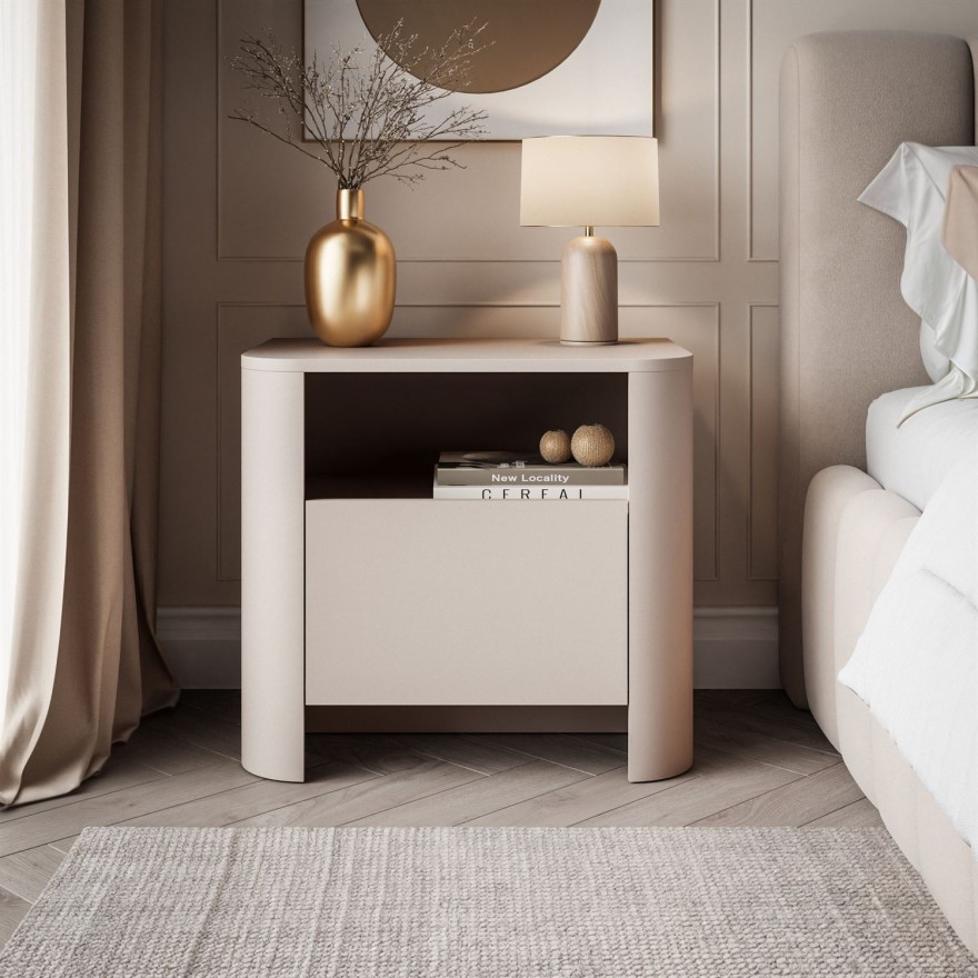 Szafka nocna DESTINY w kolorze kaszmiru łączy lekką, elegancką formę z praktycznymi rozwiązaniami. Oferuje wygodną szufladę i otwartą półkę, dzięki czemu świetnie porządkuje przestrzeń przy łóżku.
