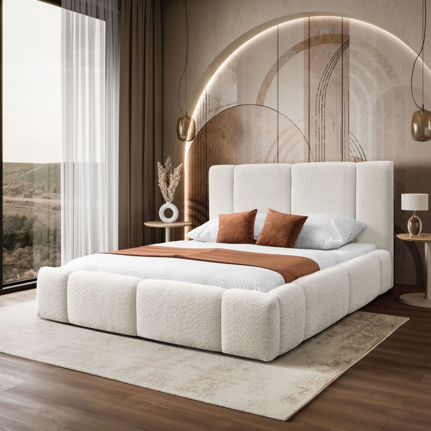 Łóżko ELENA łączy nowoczesny design, elegancję i wyjątkowy komfort dzięki tapicerowanemu zagłówkowi i miękkiej tkaninie typu baranek. Funkcjonalny stelaż i szerokie możliwości personalizacji sprawiają, że idealnie dopasowuje się do każdej sypialni.