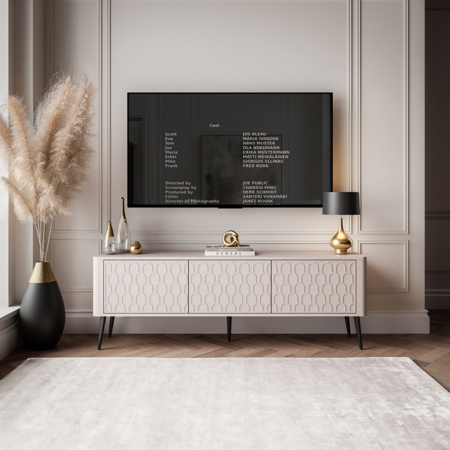 Szafka RTV 3D MILANO łączy nowoczesną elegancję z praktyczną funkcjonalnością – trzy drzwi, trójwymiarowe fronty i smukłe nogi tworzą stylowy i uporządkowany salon.