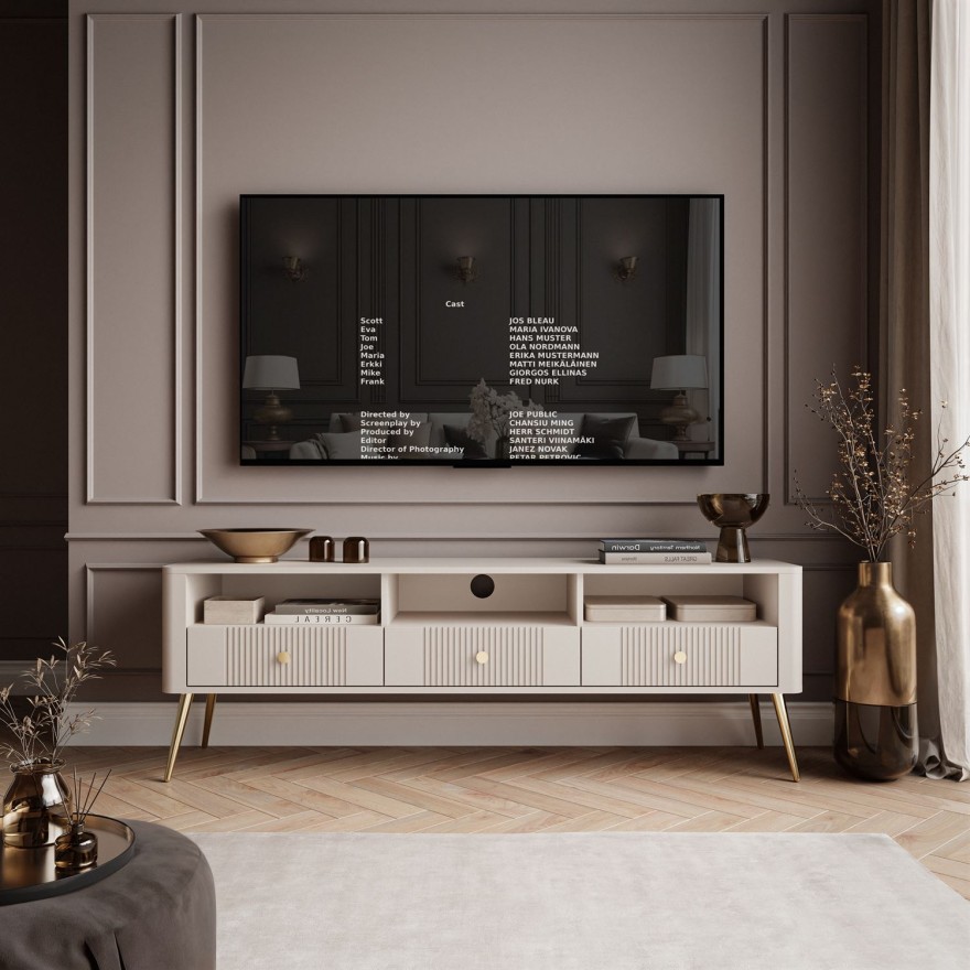 Szafka RTV ELYSIA KASZMIR to połączenie nowoczesnej elegancji z praktycznym układem – trzy pojemne szuflady oraz otwarta przestrzeń na sprzęt RTV zapewniają wygodne przechowywanie. Ryflowane fronty oraz metalowe nóżki nadają meblowi lekkości, subtelnego stylu i nowoczesnego charakteru.