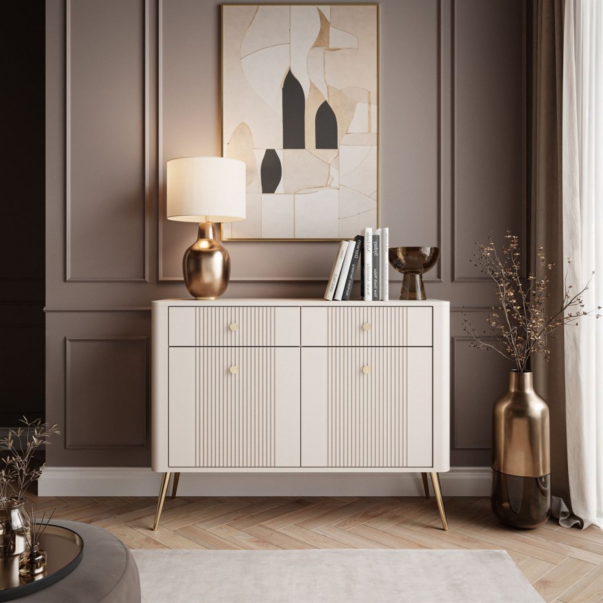 Komoda ELYSIA KASZMIR łączy nowoczesną elegancję z praktycznym designem – dwie pojemne szuflady oraz zamykane szafki pozwalają wygodnie uporządkować wszystkie przedmioty. Ryflowane fronty i metalowe nóżki nadają bryle lekkości, podkreślając jej subtelny styl i nowoczesny charakter.