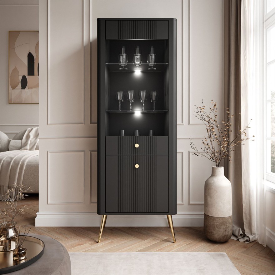 Witryna ELYSIA łączy nowoczesną elegancję z funkcjonalnością – przeszklona część ekspozycyjna, pojemna szuflada oraz zamykana szafka zapewniają wygodne przechowywanie i efektowne wyeksponowanie dekoracji.