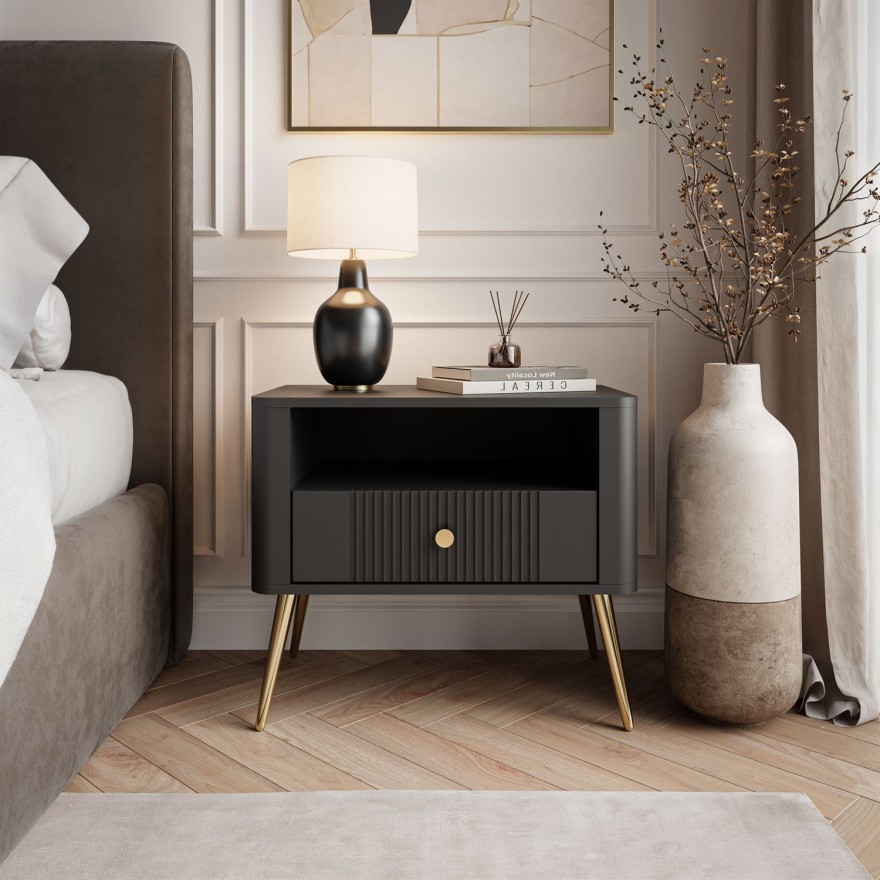 Charakterystycznym elementem stolika jest ryflowany front szuflady, który pięknie odbija światło, tworząc efekt głębi i wyrafinowanej struktury. Złoty uchwyt stanowi biżuteryjny akcent, idealnie komponując się z czarną bryłą mebla i podkreślając jego ekskluzywny wygląd.
