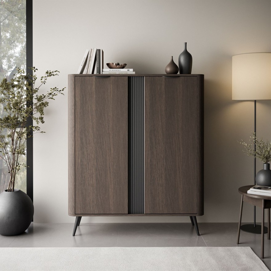 Komoda TWILIGHT to nowoczesny mebel do salonu lub jadalni, który łączy elegancki design z funkcjonalną przestrzenią do przechowywania. Ryflowana wstawka oraz smukłe, metalowe nóżki nadają jej lekkości i sprawiają, że doskonale wpisuje się w aranżacje w stylu loftowym, minimalistycznym i nowoczesnym.
