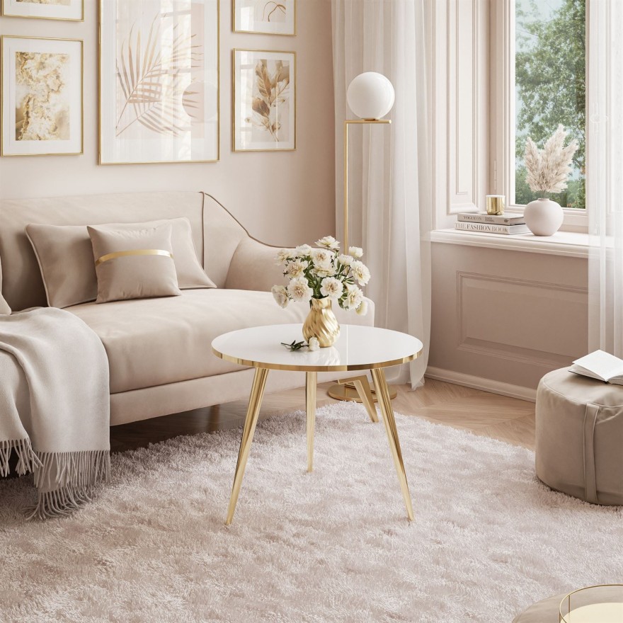 Blat stolika, dostępny w klasycznej bieli lub głębokiej czerni o wysokim połysku, to absolutna elegancja. Wykończenie w połysku nadaje meblowi lekkości i pięknie odbija światło, co sprawia, że każda przestrzeń wydaje się bardziej ekskluzywna. Wyjątkowość tego modelu podkreśla złote obrzeże blatu, które dodaje mu biżuteryjnego wyglądu i tworzy efektowny, prestiżowy kontrast z gładką taflą blatu.