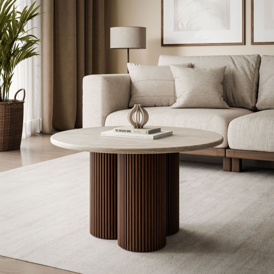 Stolik kawowy CANYON to szeroki i stabilny mebel, który przyciąga wzrok modnym połączeniem trawertynowego blatu z ryflowaną, orzechową podstawą. Dzięki swojej niższej formie i przestronnej powierzchni, stanowi idealne, stylowe centrum domowej strefy relaksu.