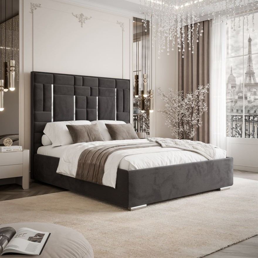Najmocniejszym akcentem modelu jest wysoki zagłówek ozdobiony rytmicznym układem paneli, które rozdzielają eleganckie, srebrne listwy. Taki zabieg nadaje bryle nowoczesnego blasku, wizualnie rozświetla wnętrze i wprowadza do sypialni klimat ekskluzywnego apartamentu. Precyzyjnie wkomponowane srebrne wstawki tworzą efektowną, dekoracyjną taflę, która przyciąga wzrok i podkreśla kunszt wykonania całego mebla.