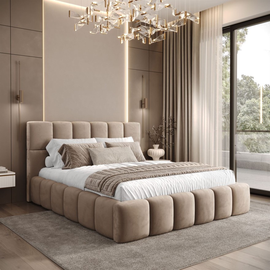 Głównym atutem modelu jest ozdobny zagłówek oraz rama wykonane z miękkich, wypukłych kostek. Nadaje to całości nowoczesny, a zarazem bardzo lekki charakter. Miękkie panele tworzą bezpieczną bryłę, która nie tylko świetnie wygląda, ale jest też bardzo wygodnym oparciem podczas wieczornego czytania książek czy oglądania filmów.
