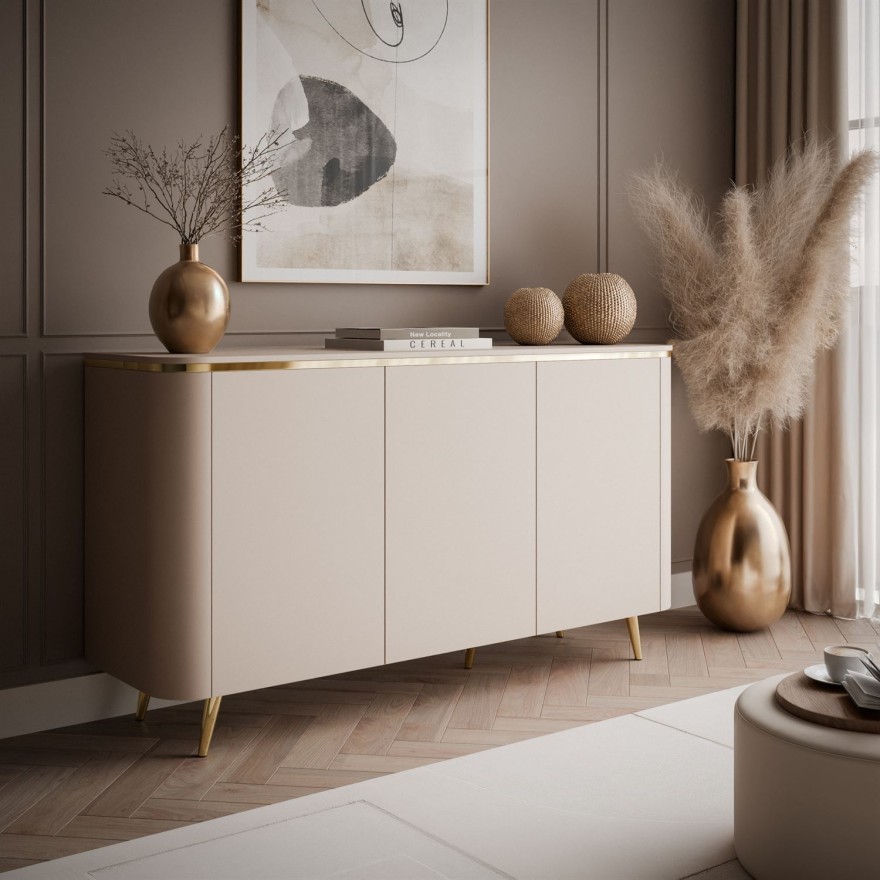 Ciepły, aksamitny odcień kaszmiru stanowi doskonałą bazę dla złotych detali. Smukłe, skośne nóżki oraz dekoracyjna listwa przy górnej krawędzi dodają całości prestiżowego charakteru. To połączenie sprawia, że komoda wygląda niezwykle szlachetnie, niezależnie od tego, czy stanie w sypialni, czy w reprezentacyjnym pokoju dziennym.