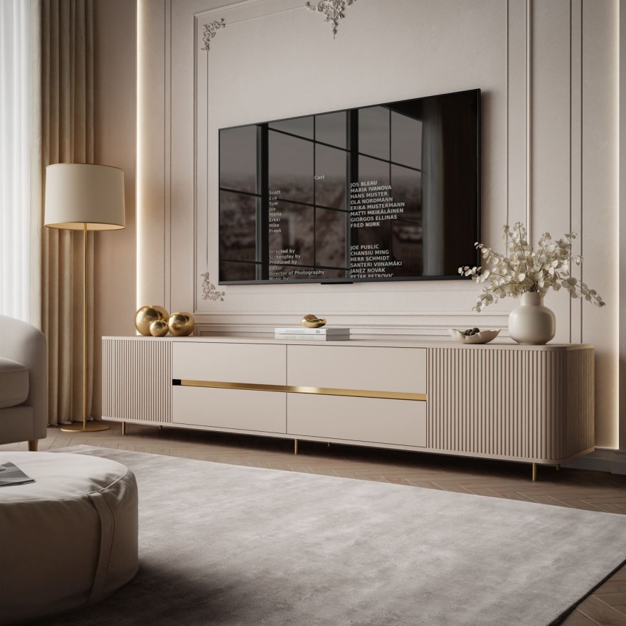 Szafka RTV MIRAGE to wyrafinowane połączenie kaszmirowego wykończenia z biżuteryjnymi, złotymi detalami i modnym ryflowaniem. Jej obła forma i smukłe nóżki wprowadzają do salonu luksusową lekkość oraz nowoczesny, harmonijny styl.