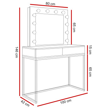 Toaletka BLANCO GLAMOUR została stworzona z dbałością o każdy detal z wykorzystaniem najlepszej jakości materiałów. Płyta laminowana w dwóch kolorach jest odporna na ścieranie i zarysowania, przez co zapewnia długi okres użytkowania. Toaletka wyposażona jest w dwie szuflady, które są wystarczająco pojemne, aby pomieścić kosmetyki i akcesoria do makijażu, a także różne bibeloty i biżuterię. Dodatkowo toaletka została wyposażona w duże lustro z 12 żarówkami LED o barwie neutralnej. Lustro w stylu hollywood to najlepsza klasa wśród luster kosmetycznych.