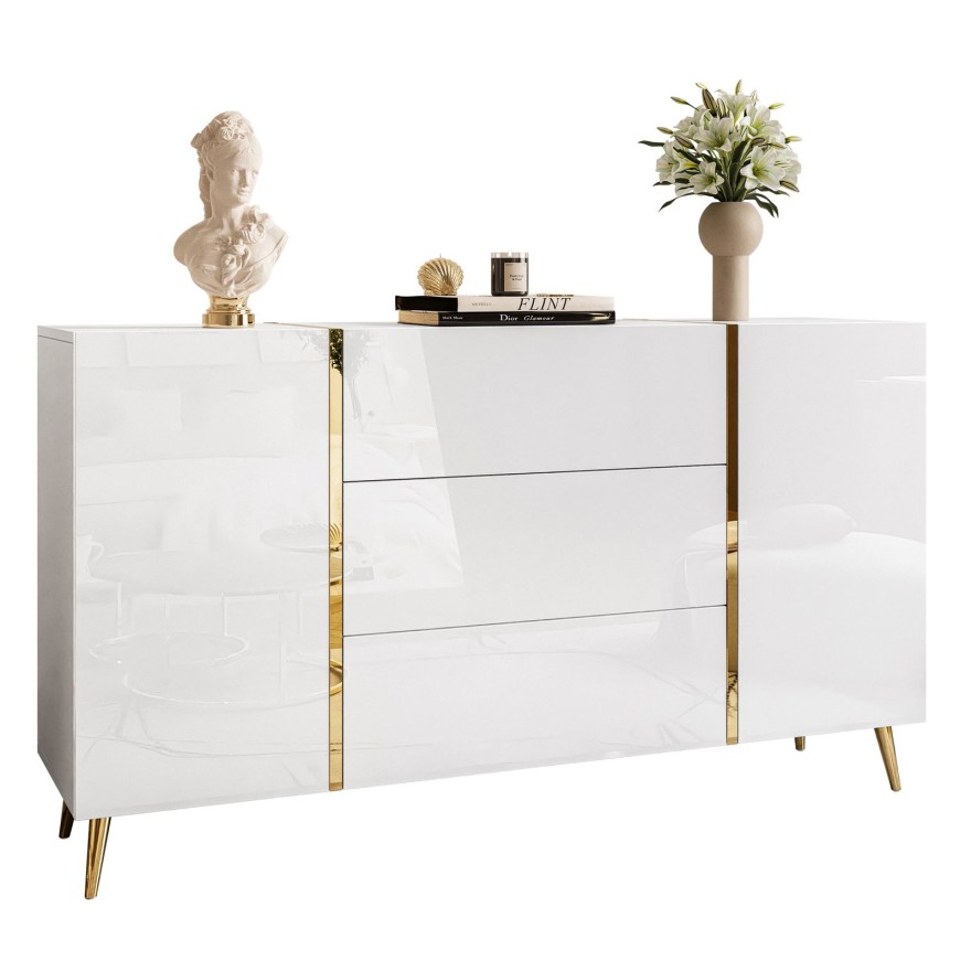 Białe, połyskujące fronty oraz eleganckie akcenty w złotym kolorze powodują, że produkt jest udaną bazą dla wystrojów w stylu glamour czy nowojorskim. Uroku całości dodają fantazyjnie wykonane nóżki z metalu, które stanowią atrakcyjną i wyrazistą dekorację w Twoim salonie.