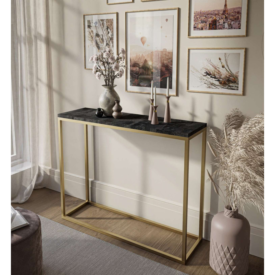Nowoczesna konsola MODERN to idealna propozycja do pełnych elegancji wnętrz. Nietuzinkowy blat wykonany z płyty imitującej ciemny beton doskonale współgra z geometrycznym, wysokim stelażem o złotej barwie.