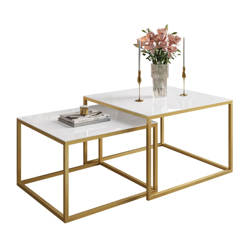 Zestaw dwóch stolików YOSHI GLASS z połyskującym blatem ze szkła hartowanego. Stoliki wpasujesz we wnętrza o stylu glamour, gdzie ich luksusowe złoto oraz połyskujące wybarwienie blatów, znakomicie uzupełni Twoją wyrafinowaną kompozycję.