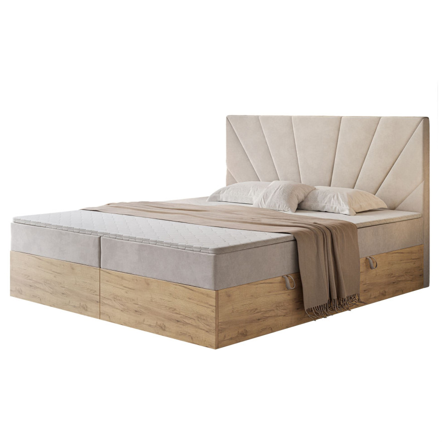Łóżko kontynentalne Asteya w kolorze dąb craft z tapicerowanym zagłówkiem oferuje elegancki wygląd i trwałą konstrukcję, doskonale komponując się z różnymi stylami wnętrzarskimi.