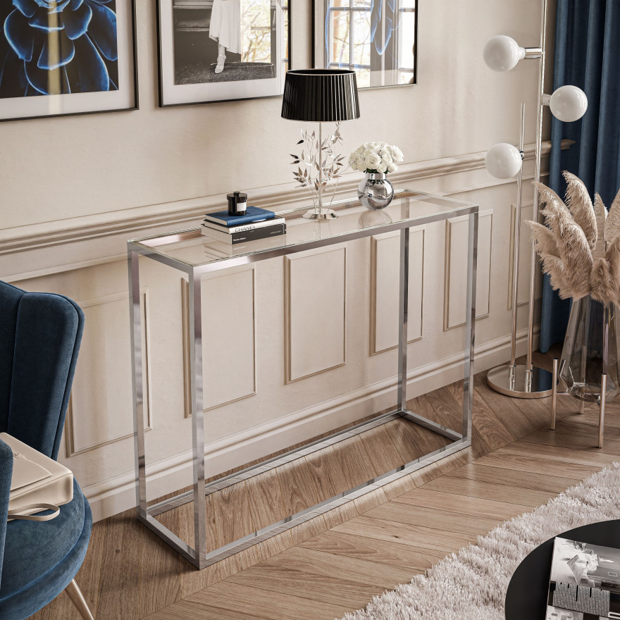 Konsola Modern, osadzona na chromowanym stelażu, to propozycja pełna stylu glamour i nowoczesnej finezji, której nie sposób się oprzeć. Jej niepowtarzalny design wzbogaca każde pomieszczenie, przyciągając wzrok i budząc zachwyt. Srebrny chrom i szklany, przezroczysty blat tworzą zjawiskowe zestawienie, zadowalając zarówno poszukiwaczy nowoczesności, jak i entuzjastów klasycznego blasku.