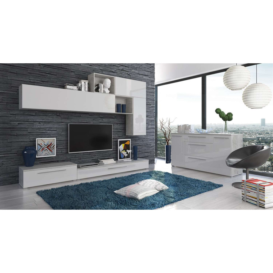 Meblościanka składa się z aż siedmiu brył : regału wiszącego, szafki wiszącej pionowej, szafki wiszącej poziomej, dwóch szafek wiszących, oraz dwóch stolików RTV. Taka ilość elementów w zestawie z pewnością odda swój potencjał pomieszczeniu i sprawi, że stanie się ono bardziej eleganckie i intrygujące.