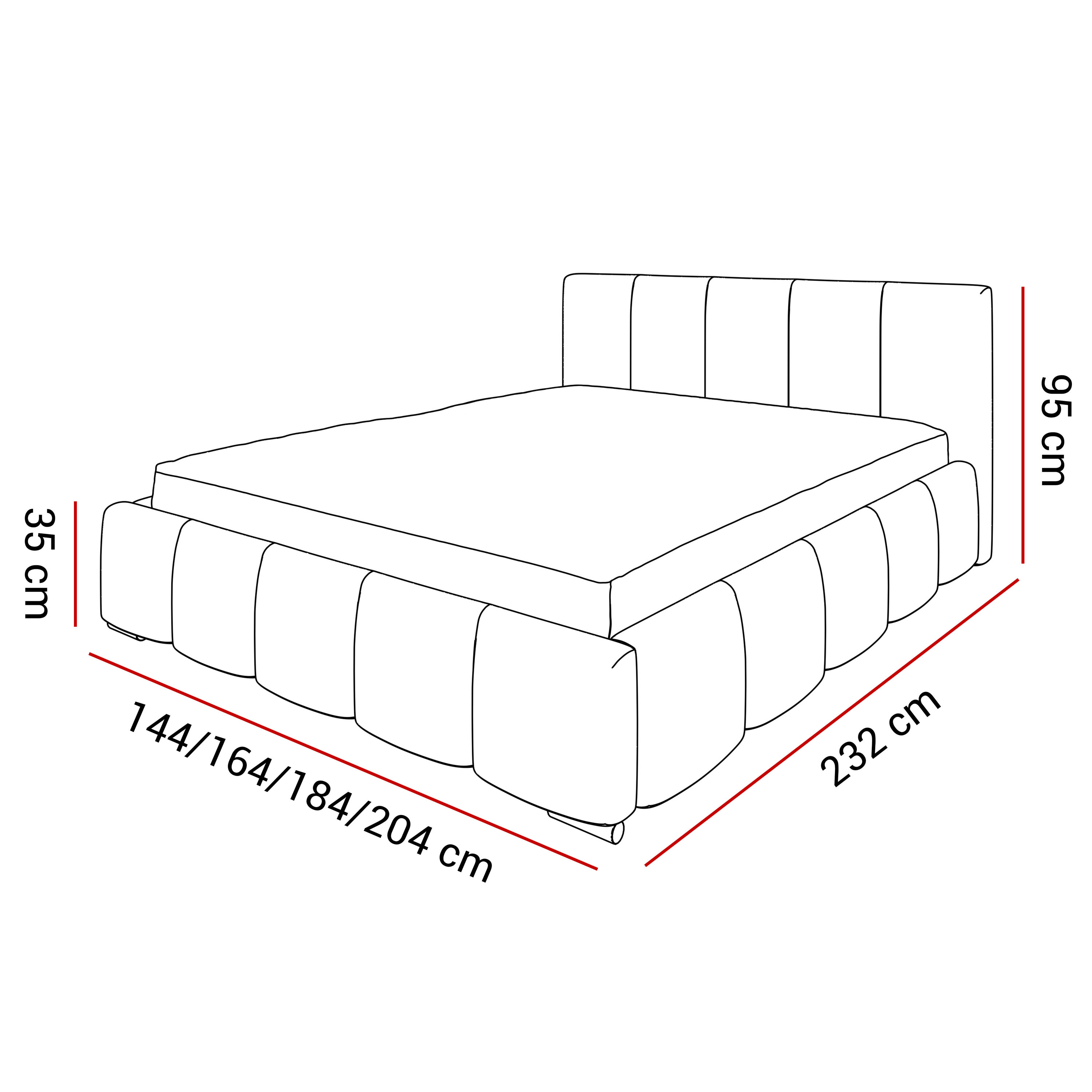 - powierzchnia spania: 160x200 cm, szerokość całkowita: 184 cm, długość całkowita: 232 cm, wysokość zagłówka: 95 cm, wysokość boku: 30 cm, wysokość przodu: 30 cm wysokość z nóżkami bez materaca: 35 cm,